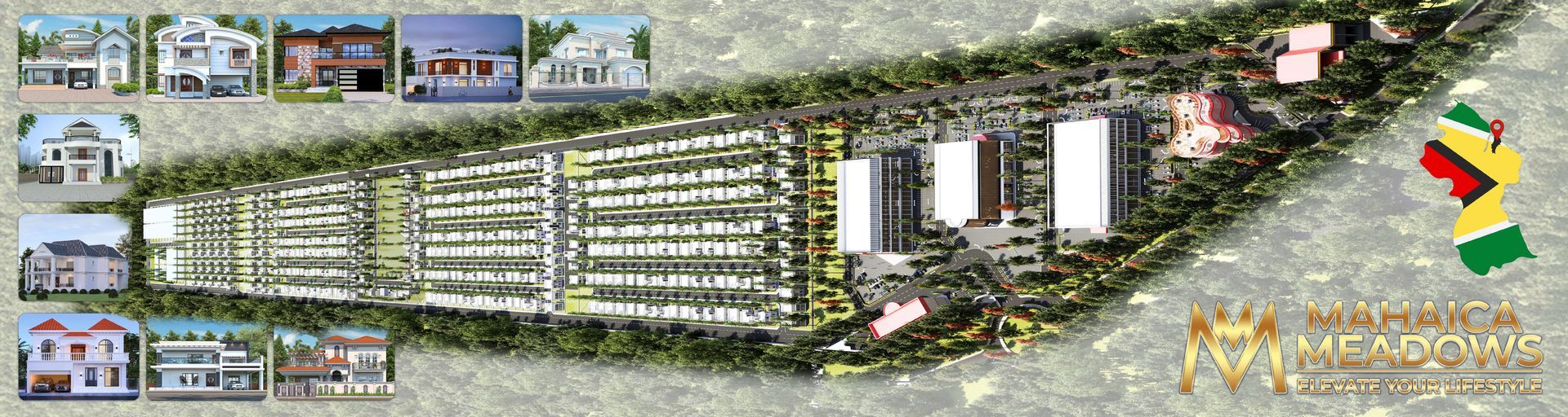 Planned amenities include a gas station, building supplies, Mahaica Meadows head office, medical building, offices, grocery stores, restaurants, shopping mall and banquet hall.